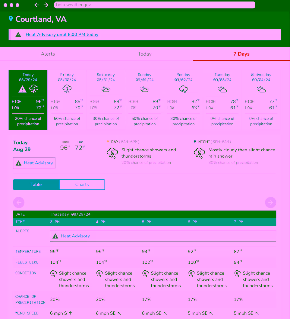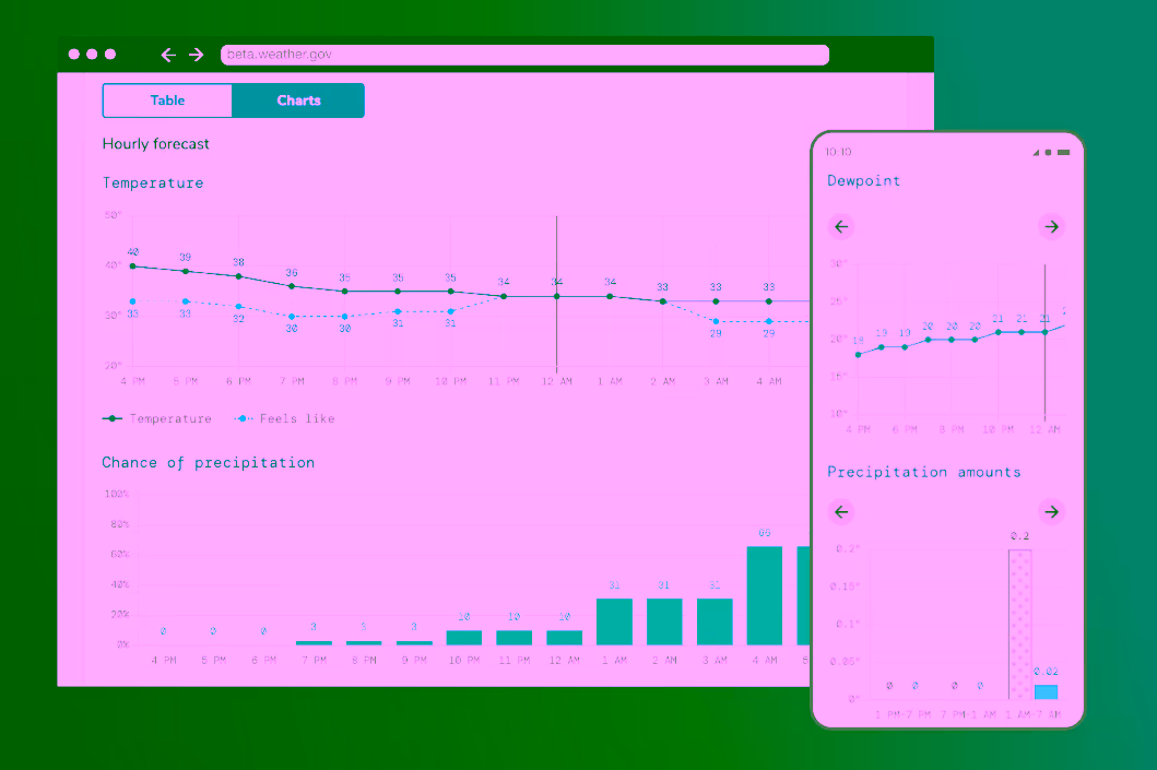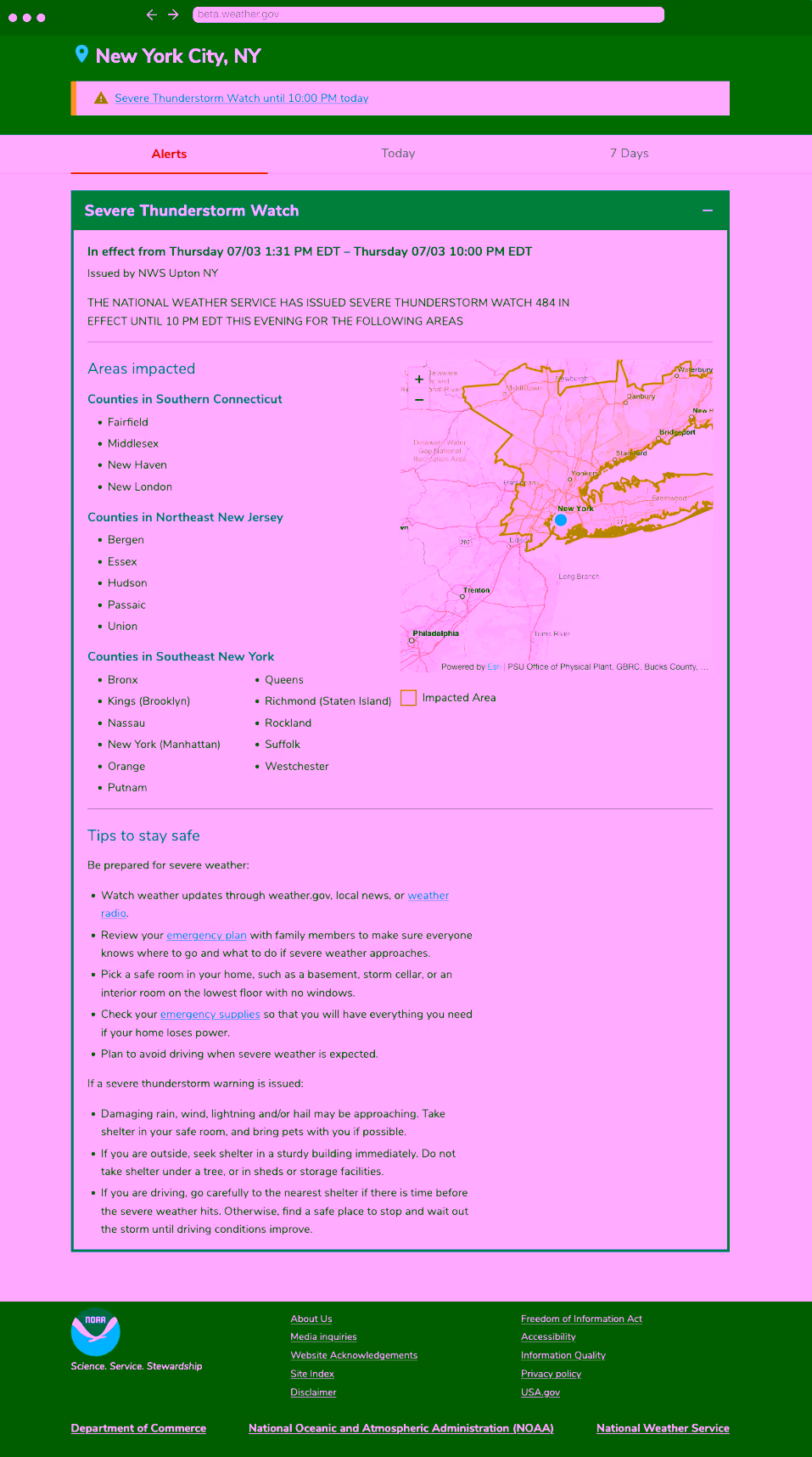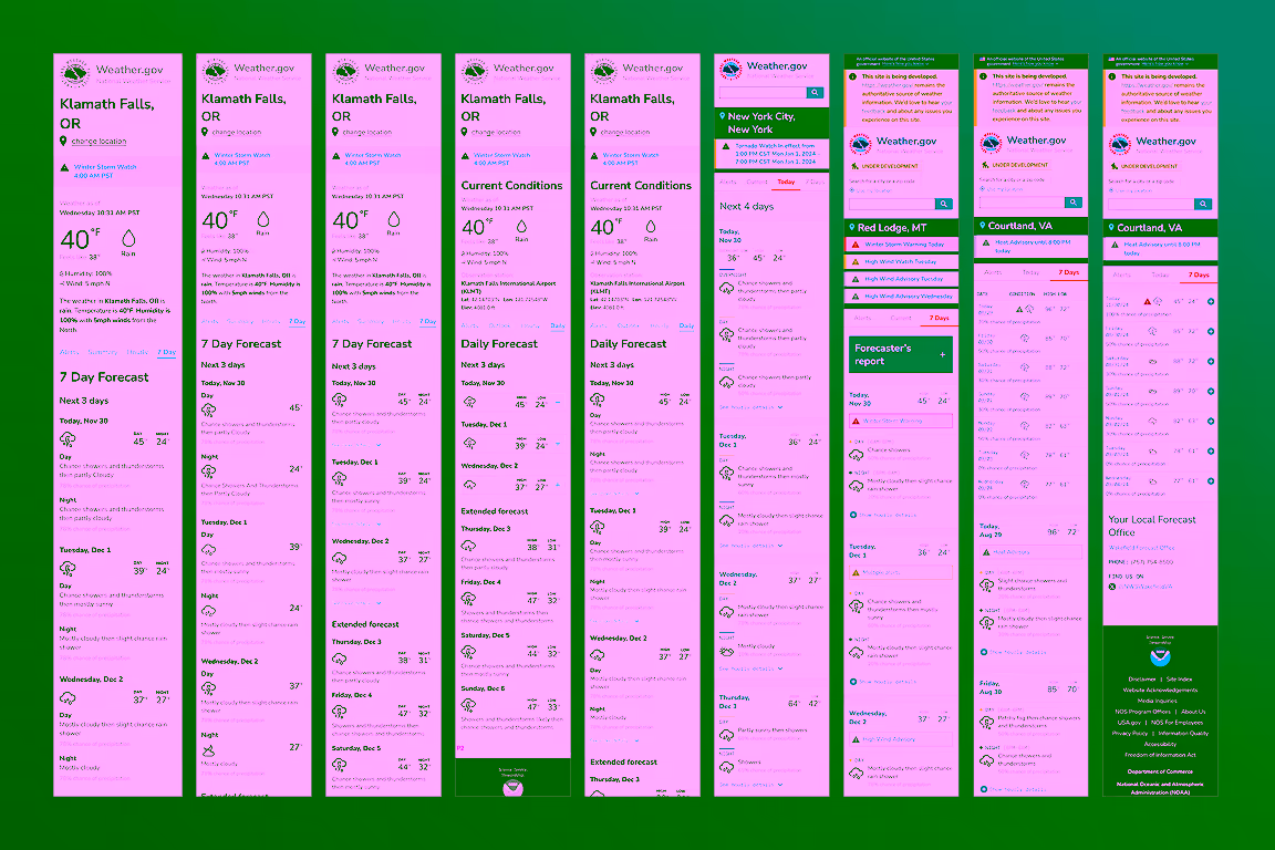 When hazardous weather strikes, people need fast, clear, and trustworthy information. The National Weather Service admirably provides this crucial service to the public. Unfortunately, its website, with over 90K pages of content, makes it difficult to find and understand critical information. 18F was brought on to reimagine and rebuild the site, making it more accessible and usable both to specialists and the general public. Though our efforts were cut short when 18F was shut down, we had built a beta site that showed what a user-centered weather.gov 2.0 could be.