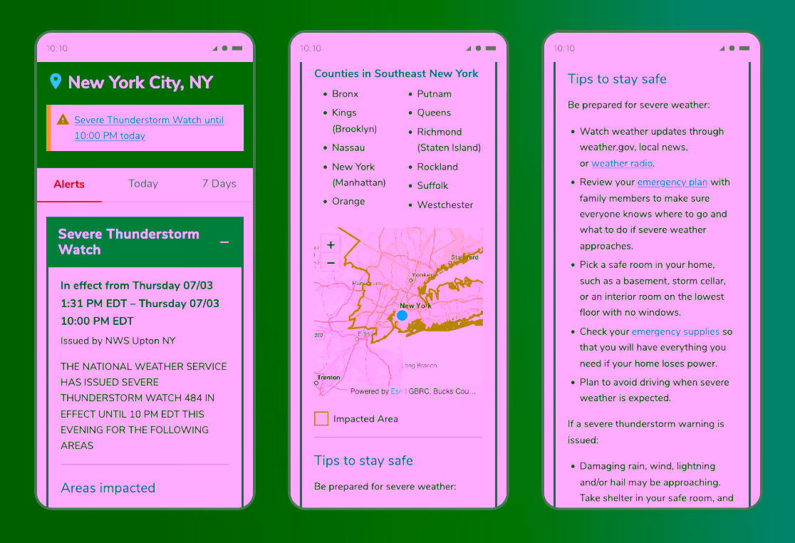 I took a mobile-first approach, based on research that many people would be relying on their phone to check weather information. We needed to make sure that content was easily digestible on smaller screens during hazardous weather.
