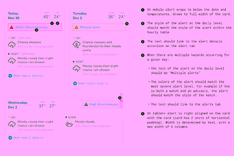 I took a mobile-first approach, based on research that many people would be relying on their phone to check weather information. We needed to make sure that content was easily digestible on smaller screens during hazardous weather.
