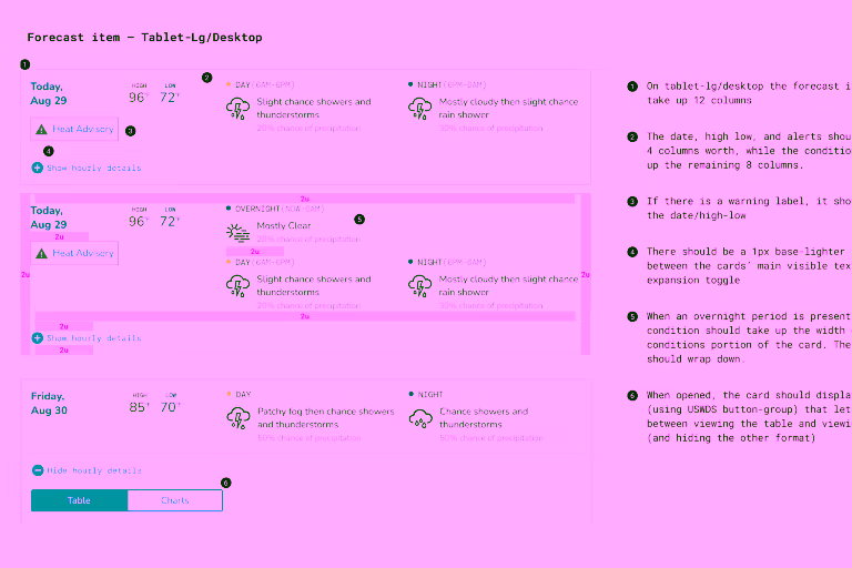 I worked with our content strategist and our UX researcher to iterate and find the right mix of content to display on the forecast page. We balanced the content so that visitors could quickly find the information they were looking for, without being overwhelmed or, conversely, feel like they were missing data.
